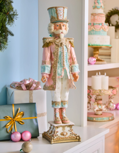 Indulge in the romance and richness of old-world France with Joyeux Noël, Katherine’s Collection’s opulent Christmas theme that captures the romance, elegance, and indulgence of the French Renaissance. Lavished in pastel pinks, greens, and blues, and accented with soft gold embellishments, this breathtaking holiday collection transforms your home into a royal fête filled with charm and sophistication. Historically inspired costumes evoke the opulence of royal courts, adorned with delicate embroidery, pearls, and gilded trim. Every item is dressed to dazzle—from elegantly dressed swan with powdered wigs to dashing nutcracker and Santa straight from a château ballroom.
